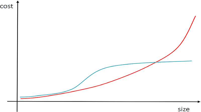 The red line represents the case where we need to go screen by screen and add the technical feature and the blue line represents the case where we have a well encapsulated data access implementation that allows such extensions. We see that in the second case the cost hardly grows by size, after we have such a data access implementation in place.