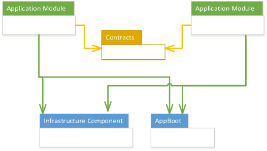 Even more we could have more functional modules isolated in different assemblies. We can make these functional modules assemblies to have no references among them (as the above diagram shows). Even if they depend one on the other functionally, they don't need to have direct dependencies one on the other, and this could be enforced by not allowing references among them. So we'll not have direct dependencies between the implementations, they will only depend through abstractions which are the contracts. (The above diagram shows that the two Application Module assembly reference the Contracts assembly and the AppBoot assembly, but they don't reference each other).