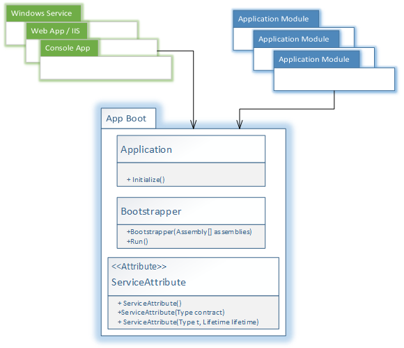 - iQuarc.AppBoot - the core library, which does not depend on any type of .NET application, nor on a specific dependency injection framework