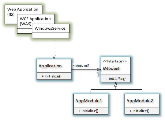 Moreover, with the modules support the AppBoot brings, we can isolate our application code from the .NET host process. This means that the application could be hosted by a ConsoleApp or by a WindowsService, or by some other kind of .NET process because it does not depend on it.