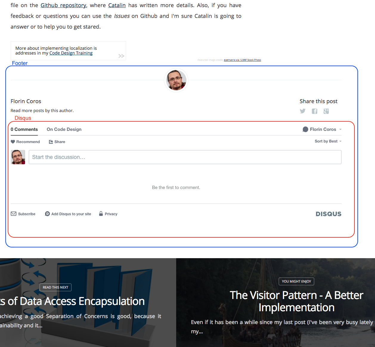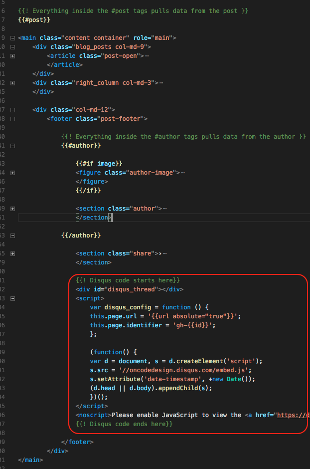 Depending on your theme, you might have a footer section, like I have, and you'd probably want the Disqus comments to go in there and not at the end of the article. In my case, I wanted it inside the footer, so it gets its styling, but after the author and the share this post sections, so the code went inside <footer> which is inside {{#post}}.
