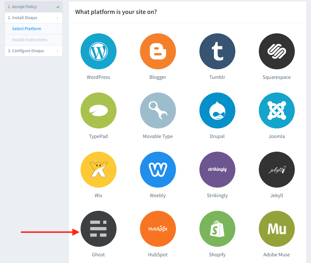 After I've created the account and accepted the policy, at the Select Platform step, I had Ghost as an option,