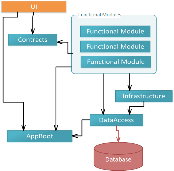 Here we can see that we do not have references between the assemblies that implement the business logic, the Functional Modules. They communicate only through abstract interfaces placed into the Contracts assembly. The Contracts assembly contains only interfaces and DTOs. No logic. With this we make sure that we will not create dependencies between implementation details of the functional modules. The functional modules can access data through the DataAccess assembly, but they cannot go directly to the database. They don’t have any UI logic since they do not have references to UI frameworks assemblies (like System.Web or System.Windows). The UI assembly gets the functionality and data only through the abstract interfaces from Contracts assembly. They can’t do data access otherwise. All are linked through Dependency Injection, which is abstracted by the AppBoot assembly.