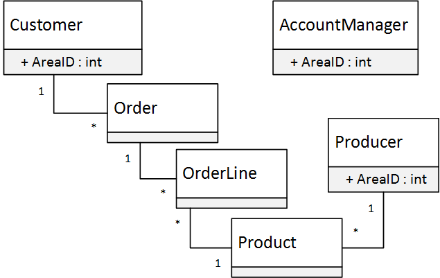 , and we want to restrict the access to the Order rows such that the current user, if she is an account manager, to see only the orders of the customers that are in her area. For this case, we need to append the order.Customer.AreaID == currentUserAreaID filter to all the queries that go on the Order entity.
