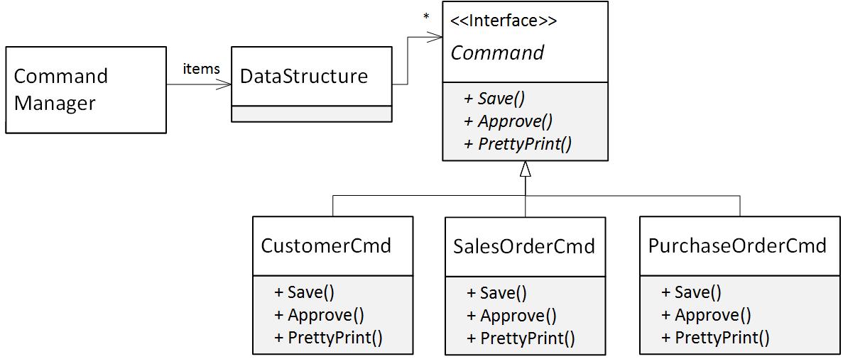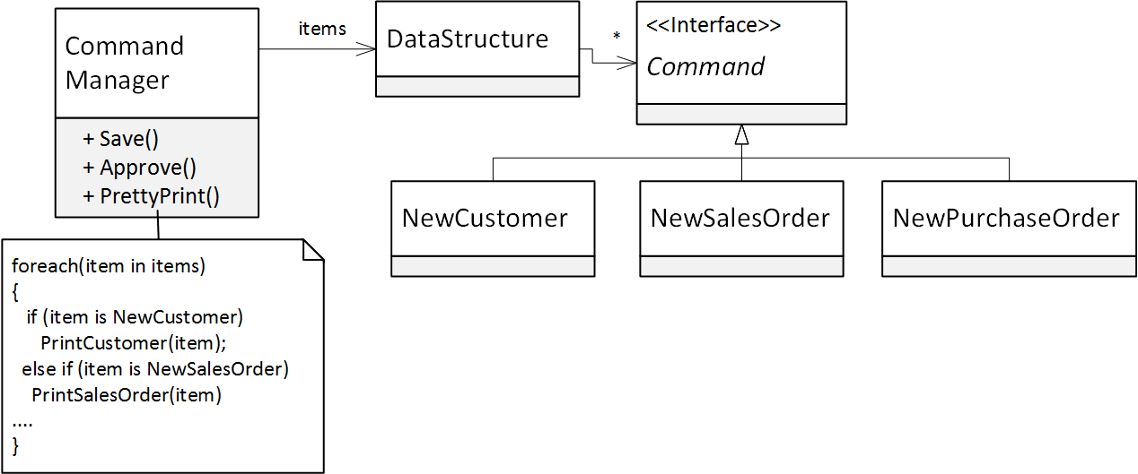 One way to do these operations on all the items we have, is to add these functions to the client code, the CommandsManager class in our example. The result would be: