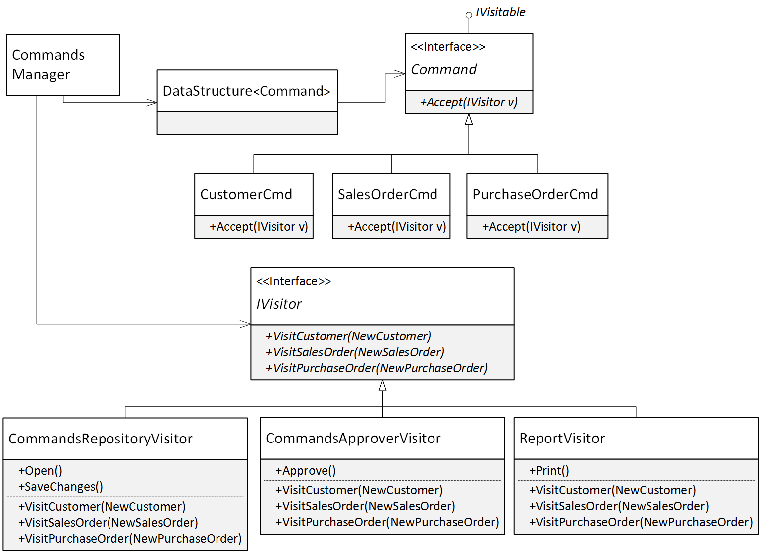The visitors are classes that focus on the behavior only and on one operation only. They implement the operations we want. When we need a new operation we will create a new visitor and so on. For example the ReportVisitor creates a printable report with all the commands. It is used to implement the PrettyPrint() operation.